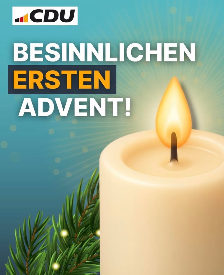 Die CDU Dülmen wünscht allen Bürgerinnen und Bürgern einen besinnlichen 1. Advent.Möge das erste Licht am Adventskranz Wärme, Zuversicht und Gemeinschaft in diese besondere Zeit bringen.Wir danken allen, die sich in Dülmen ? ob ehrenamtlich, beruflich oder privat ? für ein starkes Miteinander einsetzen.Lassen wir uns gemeinsam auf den Weg in eine friedvolle und hoffnungsvollle Adventszeit machen.Einen schönen ersten Advent!Ihre CDU Dülmen#ErsterAdvent #Advent2025 #CDUDülmen #GemeinsamFürDülmen #Adventszeit #Besinnlichkeit #Zuversicht #Miteinander #Dülmen